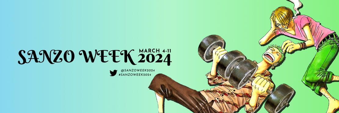 SanZo Week is a prompt-based, fan-run event dedicated to the ship of Sanji and Zoro. For the NSFW prompts, please note that this week is dedicated to the dynamic where Sanji is the top and Zoro is the bottom.